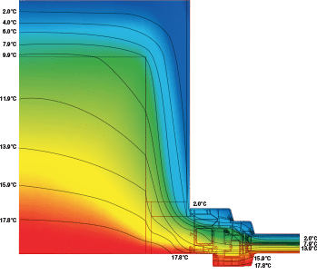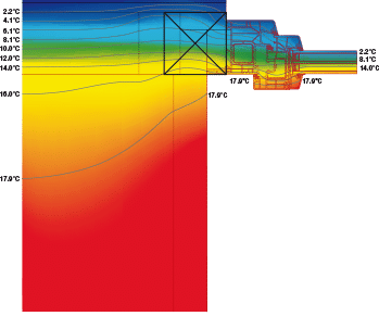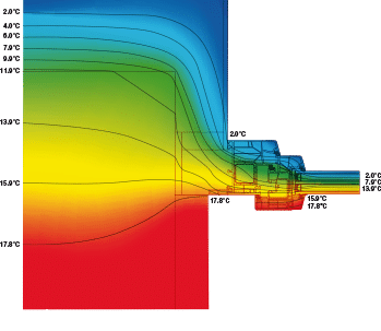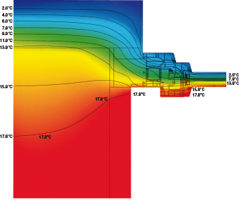 I metodi tradizionali a filo muro interno hanno lo svantaggio di portare il freddo (o il caldo nel periodo estivo) verso l’interno della casa poiché espongono il muro alla temperatura esterna anche dal lato del vano murario (disegno 1). Nel disegno 3, dove il serramento è posto a filo muro esterno con sormonto del cappotto, osserviamo che la temperatura del muro sul lato interno migliora notevolmente aumentando i valori delle isoterme. Nel disegno 4 il serramento è installato nel coibente; in questo caso anche il vano finestra e l’infisso risultano interni alla chiusura verticale mentre il controtelaio ed il serramento diventano parte integrante del cappotto creando una continuità lineare nell’isolamento.